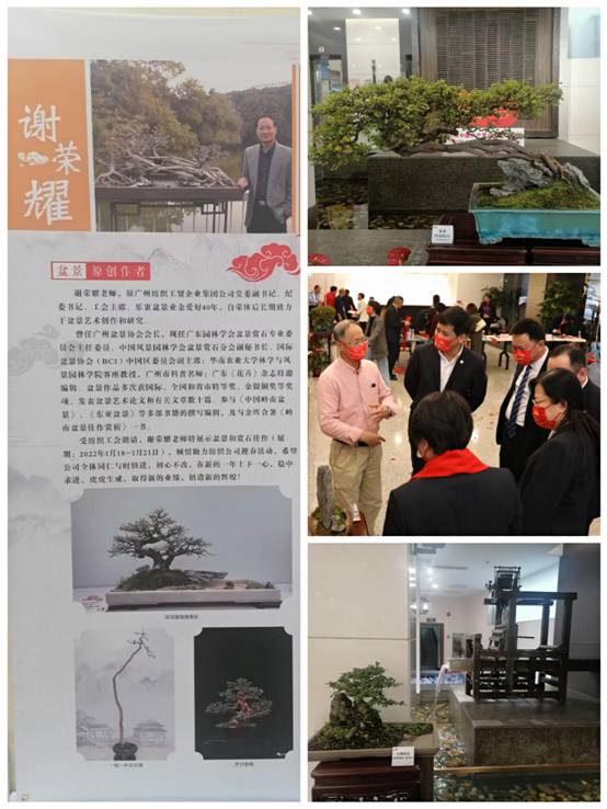 盆景是以植物和山石為基本材料在盆內(nèi)表現(xiàn)自然景觀的藝術(shù)品。為激勵(lì)廣大員工“穩(wěn)中求進(jìn)”穩(wěn)健邁步“十四五”,原廣州紡織工貿(mào)企業(yè)集團(tuán)公司黨委副書記、紀(jì)委書記、工會(huì)主席謝榮耀老師(現(xiàn)任廣東園林學(xué)會(huì)盆景賞石專業(yè)委員會(huì)主任委員)受邀公益展示了原創(chuàng)的《不忘初心》、《根深基穩(wěn)一往無前》、“咬定青山”等10個(gè)盆景靈石佳作,一枝一葉,一盆一景,妙趣橫生,寓意深刻,勵(lì)志鼓舞,吸引廣大員工駐足鑒賞。