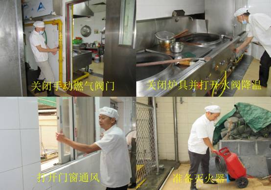 演練模擬飯?zhí)霉ぷ魅藛T在做飯過程聞到燃?xì)猱愇?,燃?xì)庾詣?dòng)關(guān)閉裝置暫未有動(dòng)作,于是立即出來報(bào)告,并順路關(guān)閉手動(dòng)燃?xì)忾y門。其他飯?zhí)霉ぷ魅藛T也隨即關(guān)閉燃?xì)鉅t具,相互提醒嚴(yán)禁觸摸電器開關(guān),打開爐具專用水閥放水降溫,在撤退過程準(zhǔn)備好滅火器,打開窗戶透氣。現(xiàn)場(chǎng)控制組在接到應(yīng)急指揮中心的命令后,對(duì)飯?zhí)贸鋈肟诶鹁渚€,接上消防水帶模擬對(duì)現(xiàn)場(chǎng)降溫,對(duì)需要進(jìn)入泄漏區(qū)關(guān)閉上端燃?xì)忾y門的排險(xiǎn)人員,確認(rèn)沒有穿帶釘鞋和化纖衣服,沒有攜帶使用金屬工具。
