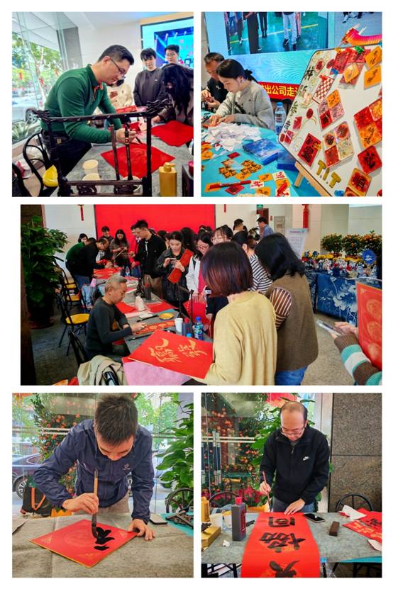 吉祥福手送祝福。在廣德一樓大堂,公司4位書法愛好者張漢彬、李運(yùn)峰、吳宏景、禤俊峰應(yīng)邀揮墨送福;設(shè)計(jì)師黃雨桐巧妙手工制作福字冰箱貼,大堂喜氣洋洋,年味十足,上百名員工參加現(xiàn)場(chǎng)接?;顒?dòng)。福手們凝神靜氣,手腕妙轉(zhuǎn),在一張張紅紙上揮灑自如地書寫“福”字和各式吉祥春聯(lián),一個(gè)個(gè)蒼勁有力或流暢飄逸或趣味可愛的“福”傳遞到接福的同事們手上,大家眉開眼笑,幸福綻放。這一傳統(tǒng)習(xí)俗承載公司對(duì)廣大員工的新年美好祈愿與祝福,場(chǎng)景溫馨而充滿喜悅?;顒?dòng)現(xiàn)場(chǎng)共送出500多份福字作品。